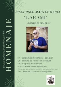 « Todos los Eventos Este evento ha pasado. Homenaje a Francisco Martín 22/04/2023 @ 11:00 - 18:00 « Conferencia «Chocolateros y botargas» Música y poesía en Hita » Añadir al calendario Google Calendar iCalendar Outlook 365 Outlook Live Detalles Fecha: 22/04/2023 Hora: 11:00 - 18:00