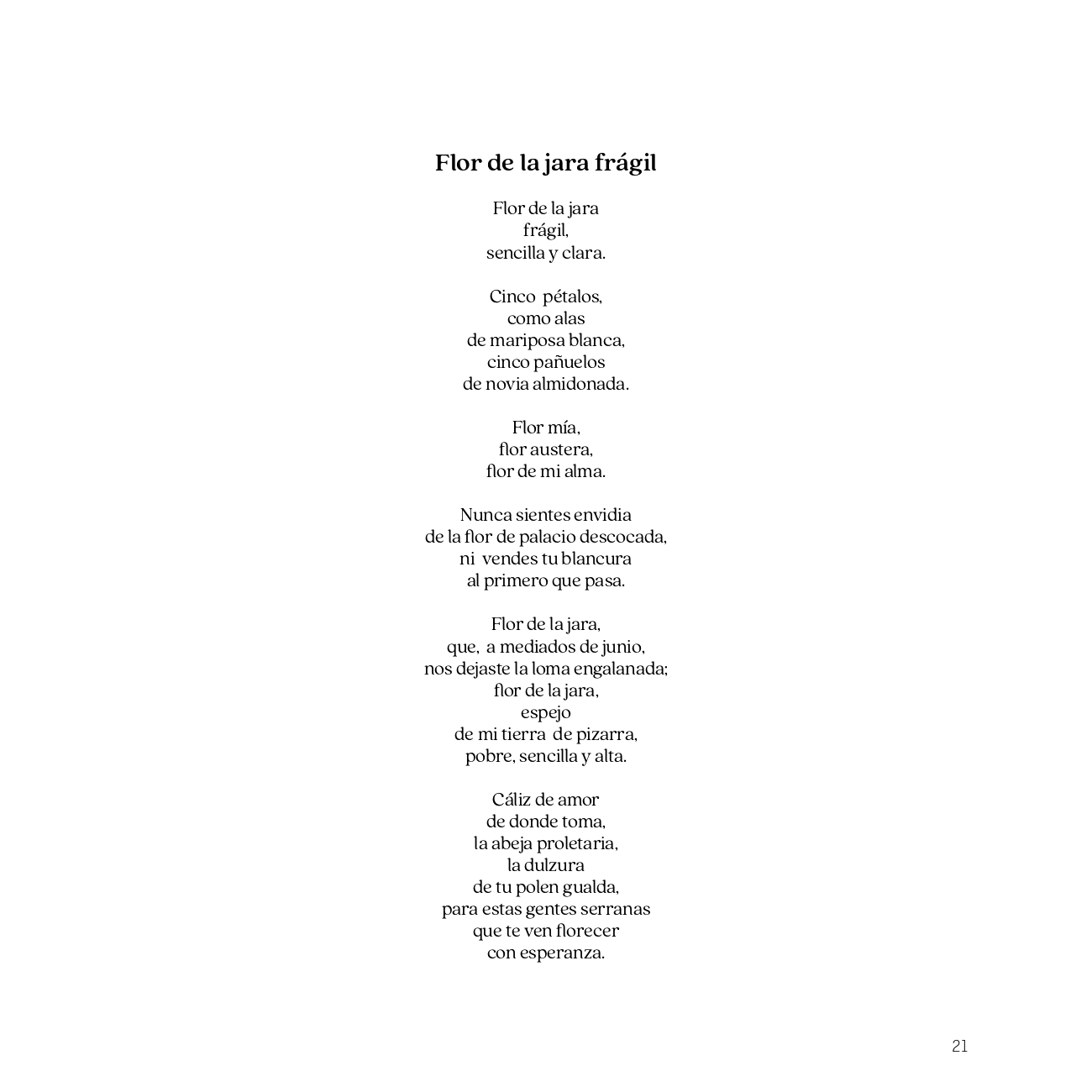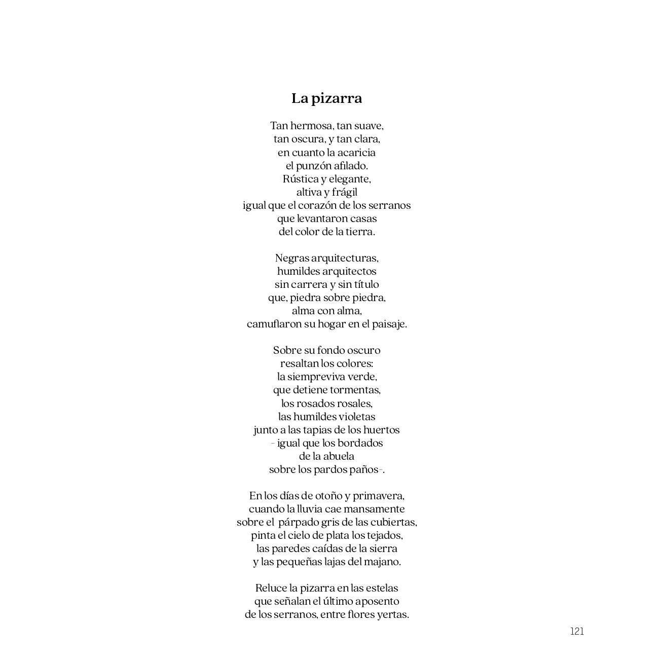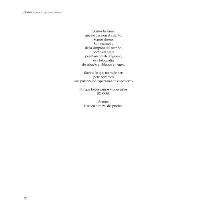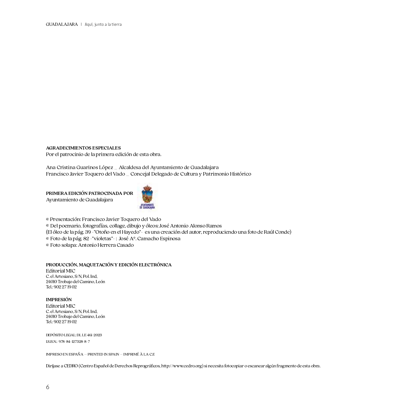 Portada «Guadalajara. Aquí, junto a la tierra»Créditos «Guadalajara. Aquí, junto a la tierra»Índice «Guadalajara. Aquí, junto a la tierra»A tus arrugas«La tía Marta». Óleo J. Aº. AlonsoDe las entrañas de la tierra«Las ventanas» (Robledo). Óleo J. Aº. AlonsoDel temprano viaje de una rosa a Madrid«Una rosa». Óleo. José Aº. AlonsoDiciembre«Diciembre». Foto José Aº. Alonso«Flores de jara». Foto José Aº. AlonsoFlor de la jara frágilIdentidad 1Identidad 2«Una maleta en el andén de los recuerdos». Sanguina y carboncillo. J. Aº. AlonsoLa pizarra«Una pared de pizarra». Óleo J. Aº. AlonsoPor los caminos del aire y de la lluvia«El país de los líquenes azules». Óleo. J. Aº. Alonso